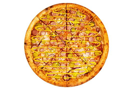 Соус томатный, сыр моцарелла, огурцы маринованные, сосиски куриные, соус горчичный